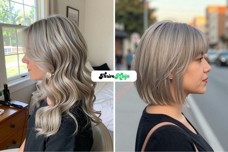 Grey blonde hair with ashy highlights has a soft, cool-toned look that can feel modern…
