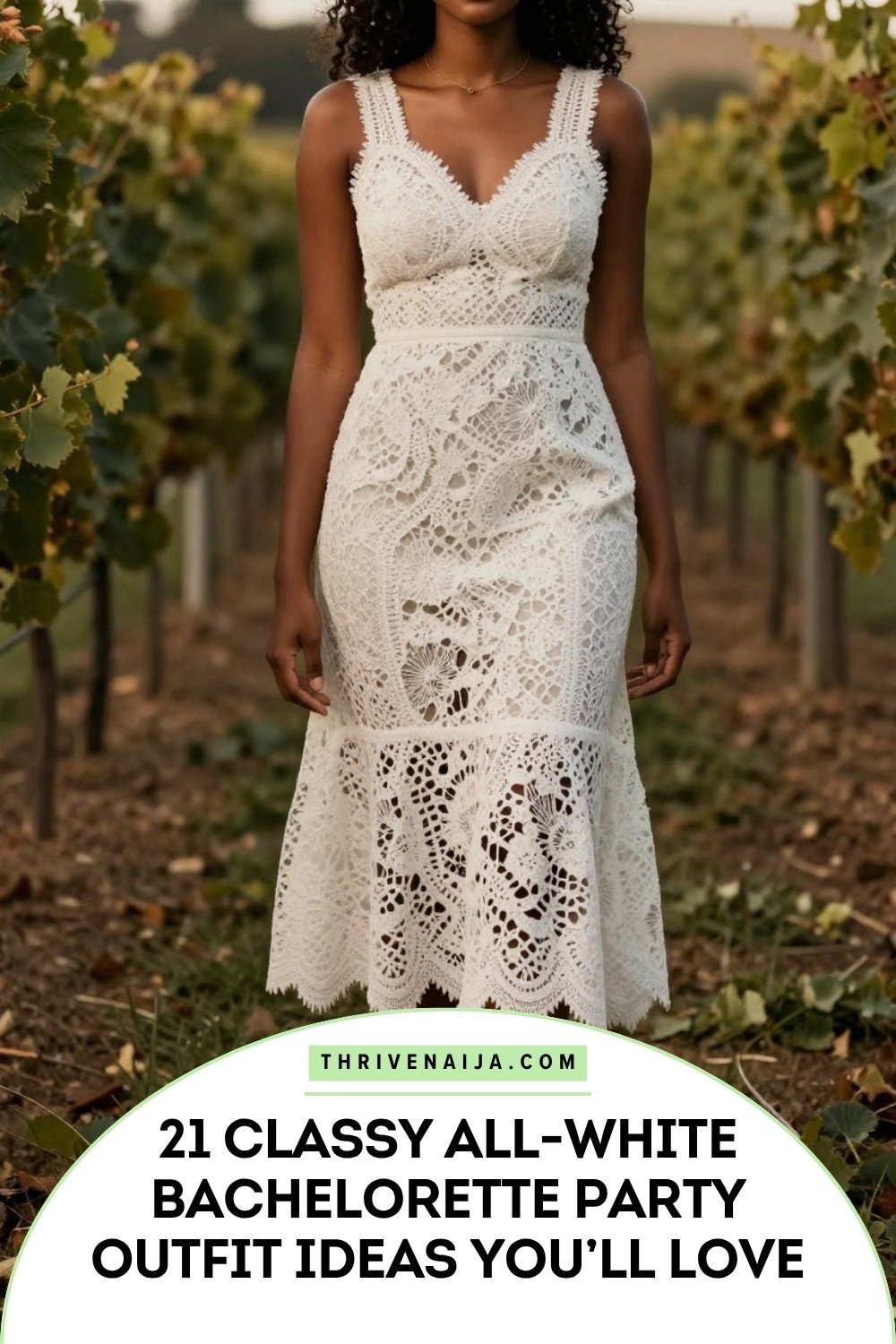 A white lace midi dress is romantic, feminine, and incredibly classy. The texture of the lace adds visual interest while the midi length keeps it sophisticated for any bachelorette occasion.