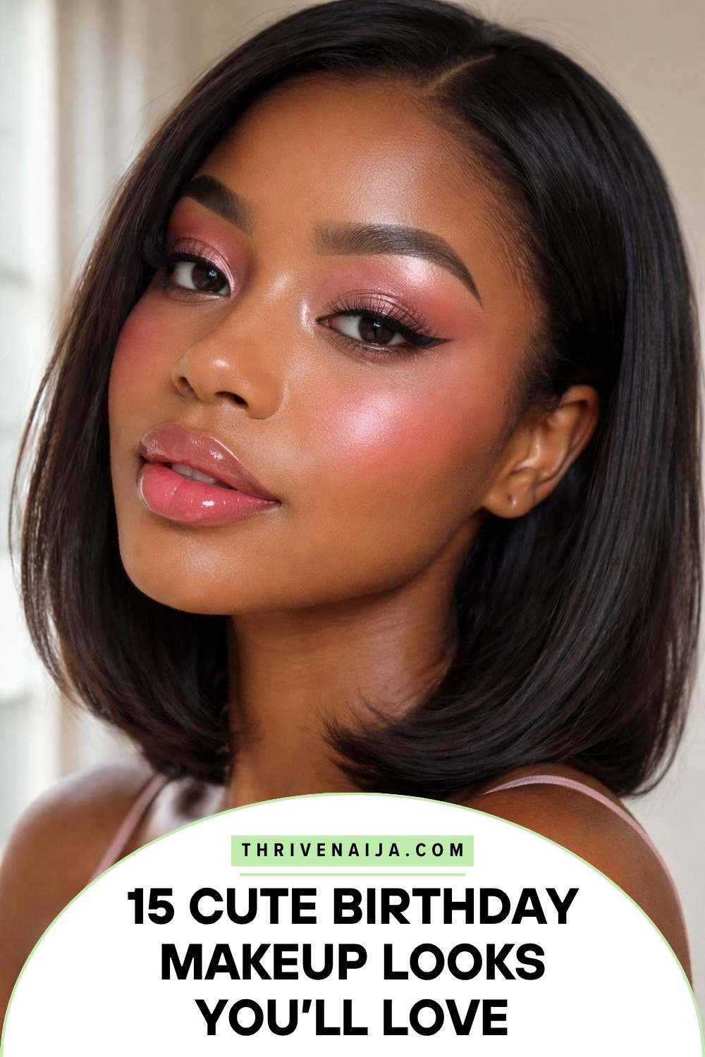 This look features soft pink eyeshadow, fluffy lashes, fresh glowing cheeks, and rosy gloss that gives the whole face a sweet birthday feel. It works so well for brunch birthdays, daytime parties, or anyone who wants something cute and playful without going too bold.