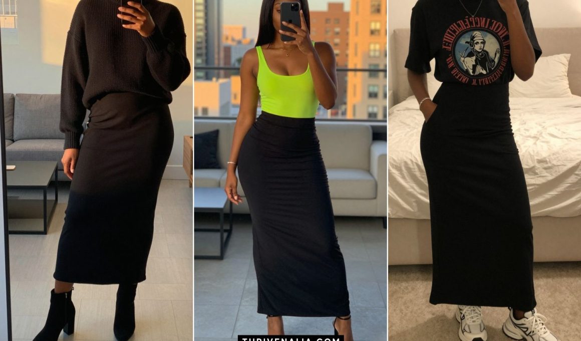 Sometimes the simplest outfit becomes unforgettable with the right accessories. A basic black maxi skirt and top combo can be transformed with bold jewelry, a colorful bag, or eye-catching shoes.