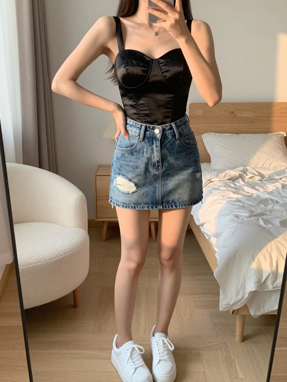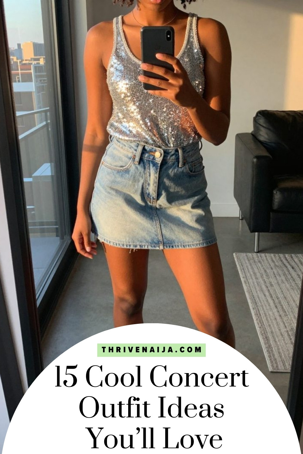 iPhone mirror selfie of a black woman wearing a silver sequin tank top with a light-wash denim mini skirt and white platform sneakers, one hand holding her phone at chest level, cropped at NECK so face doesn't show, in a city apartment, evening golden hour, iPhone photo quality.