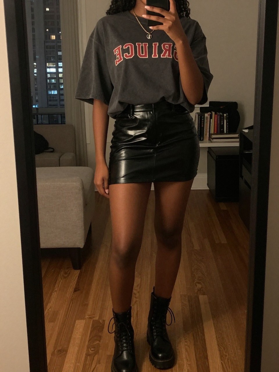 iPhone mirror selfie of a black woman wearing a cropped black band tee with an olive green utility mini skirt and chunky combat boots, one hand holding her phone at chest level, cropped at NECK so face doesn't show, in a city apartment, evening golden hour, iPhone photo quality.