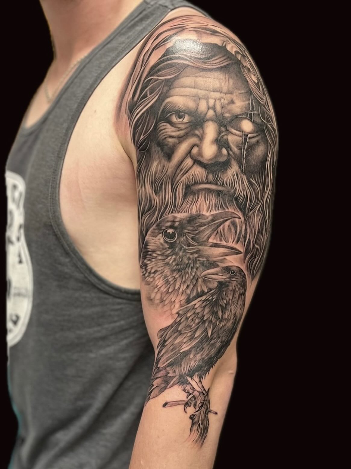 Odin’s one-eyed face and long beard bring a powerful, storytelling feel to the tattoo.