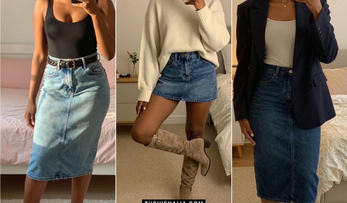 A cozy sweater and a jean skirt is the ultimate cold-weather combo. The soft texture of the sweater contrasts nicely with the denim, and you can play with proportions—try an oversized sweater with a mini skirt or a fitted sweater with a longer skirt.