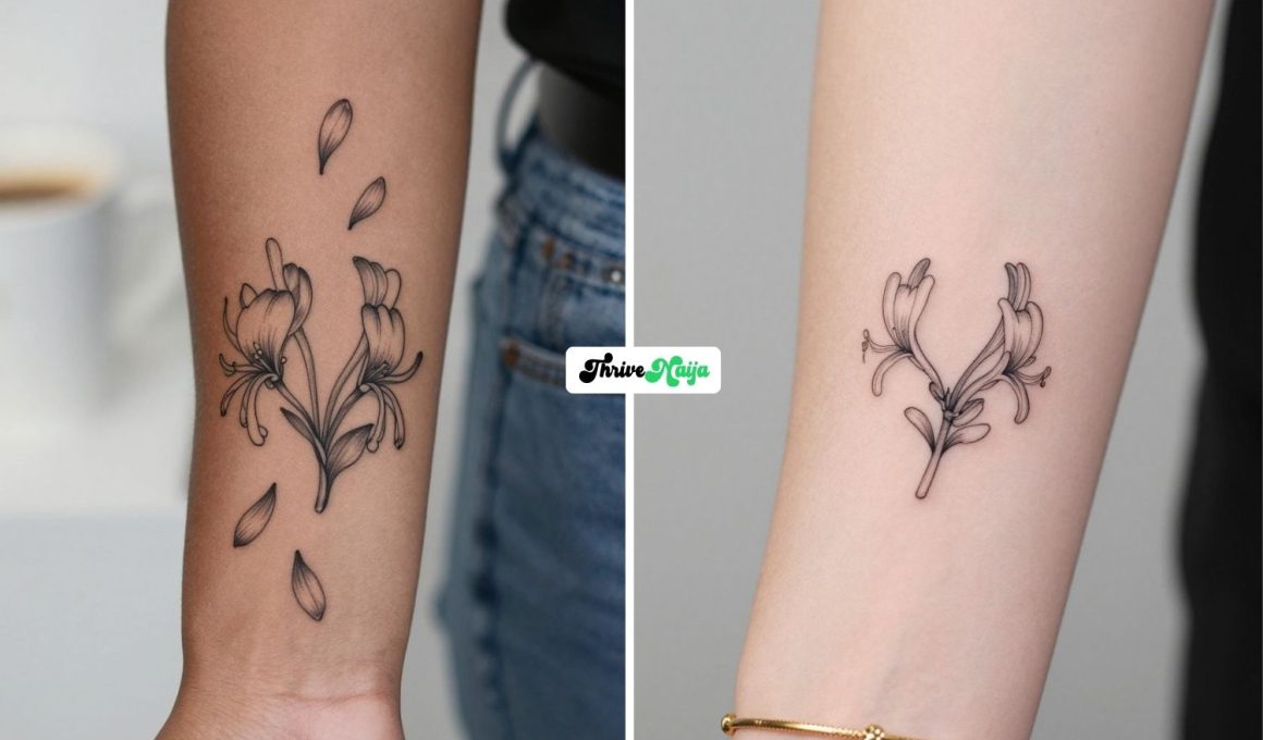A honeysuckle tattoo with a few falling petals adds gentle movement and makes the design feel more emotional and alive. It is a lovely option for someone who wants a birth flower tattoo that feels soft, expressive, and easy to connect with.