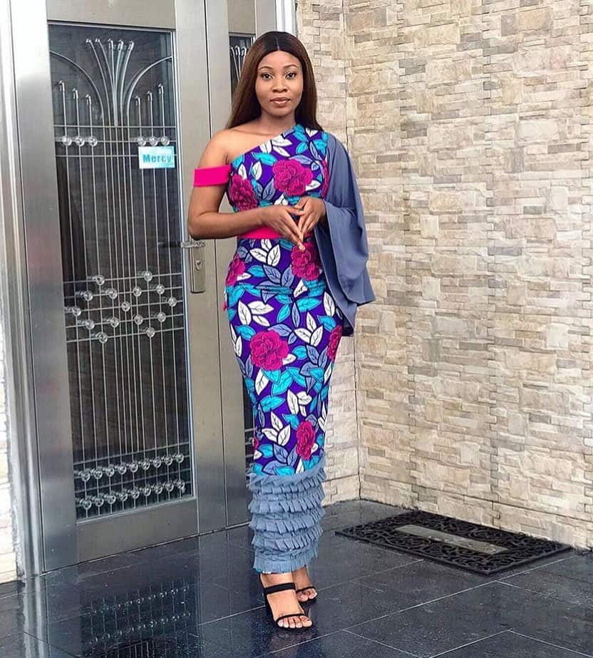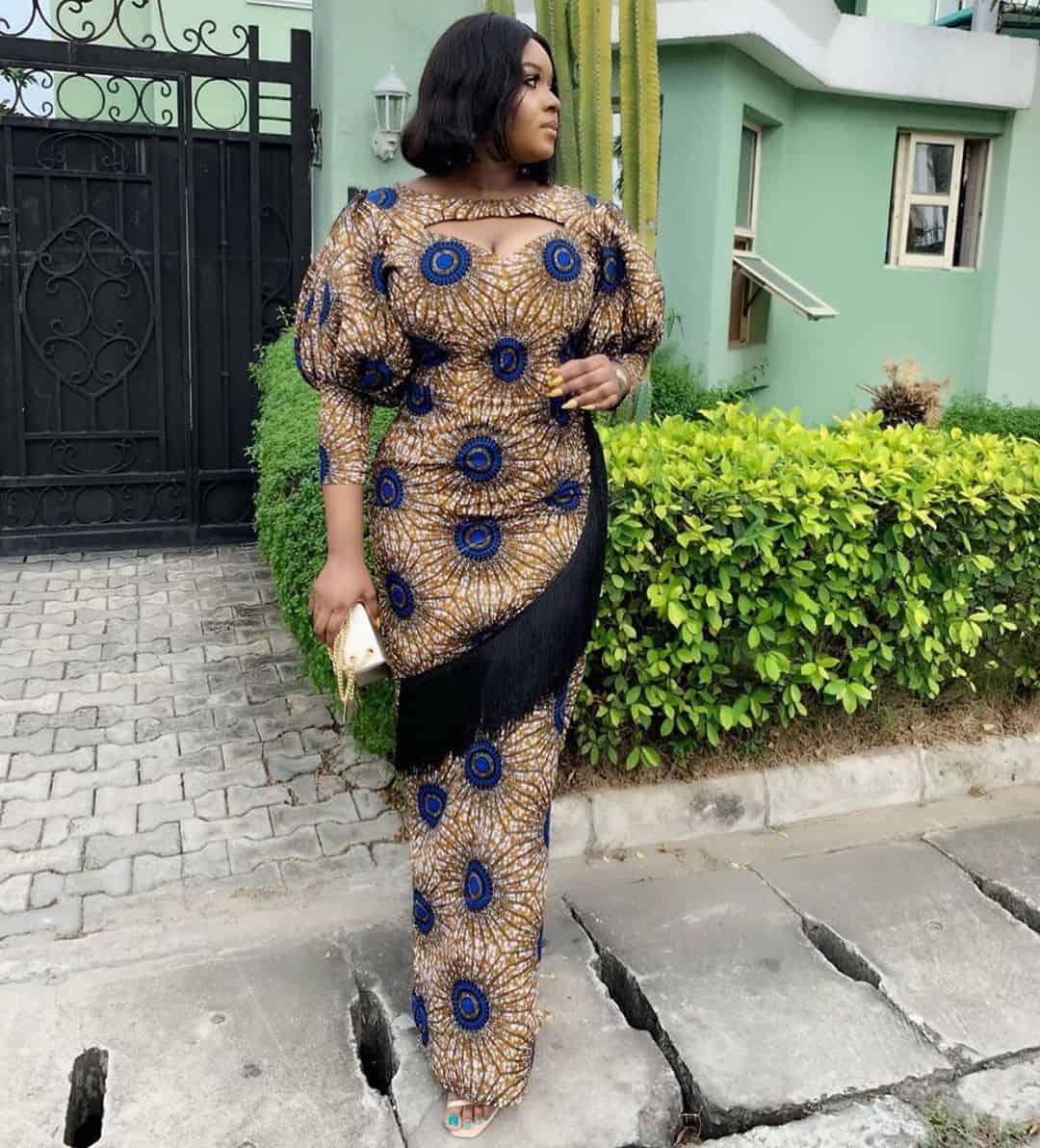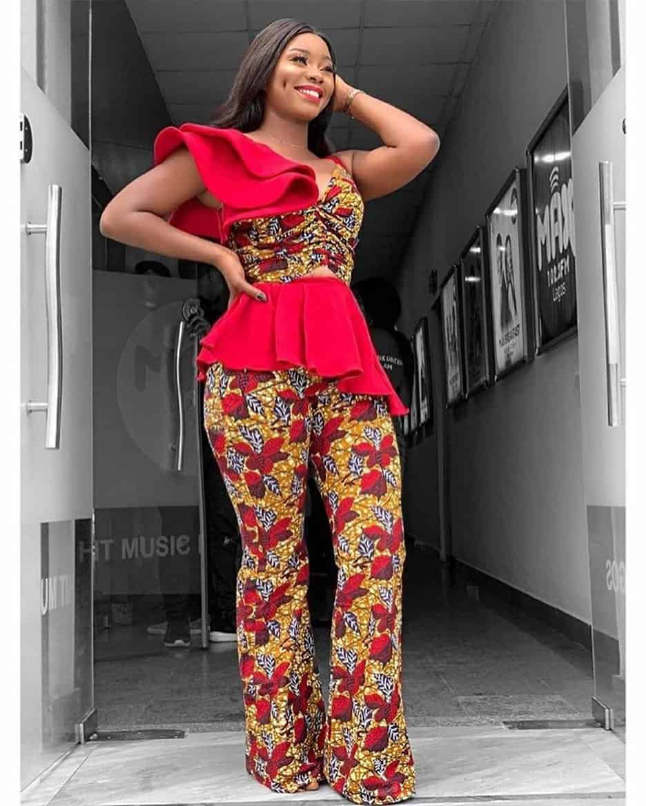 Anyone shape can pull off this style, very trendy, and with the edges of the blouse, it make it look great for cocktail parties. This is one of the latest Ankara styles from King Tonto Dike herself.