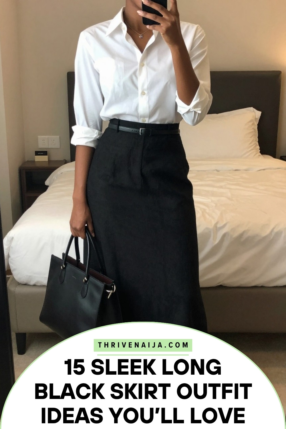 Crisp, clean, and endlessly chic. A classic white button-down shirt tucked into a long black skirt creates a look that’s both professional and effortlessly stylish. Black pointed flats keep the lines sleek and the outfit grounded.