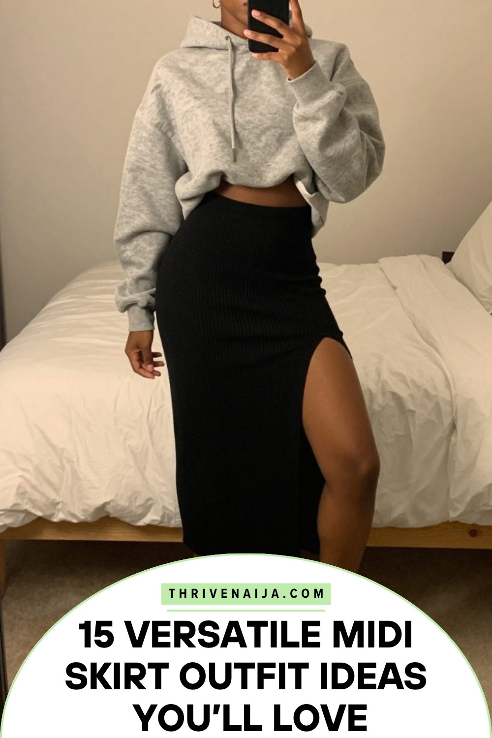 This outfit proves that midi skirts can be part of your most comfortable, cozy looks. An oversized hoodie (in a soft heathered color) is the definition of comfort. Pair it with a midi skirt, and you get this incredible contrast between slouchy and polished that feels very now. Chunky dad sneakers keep the whole thing grounded in street style. It’s unexpected, it’s comfortable, and it looks surprisingly intentional.