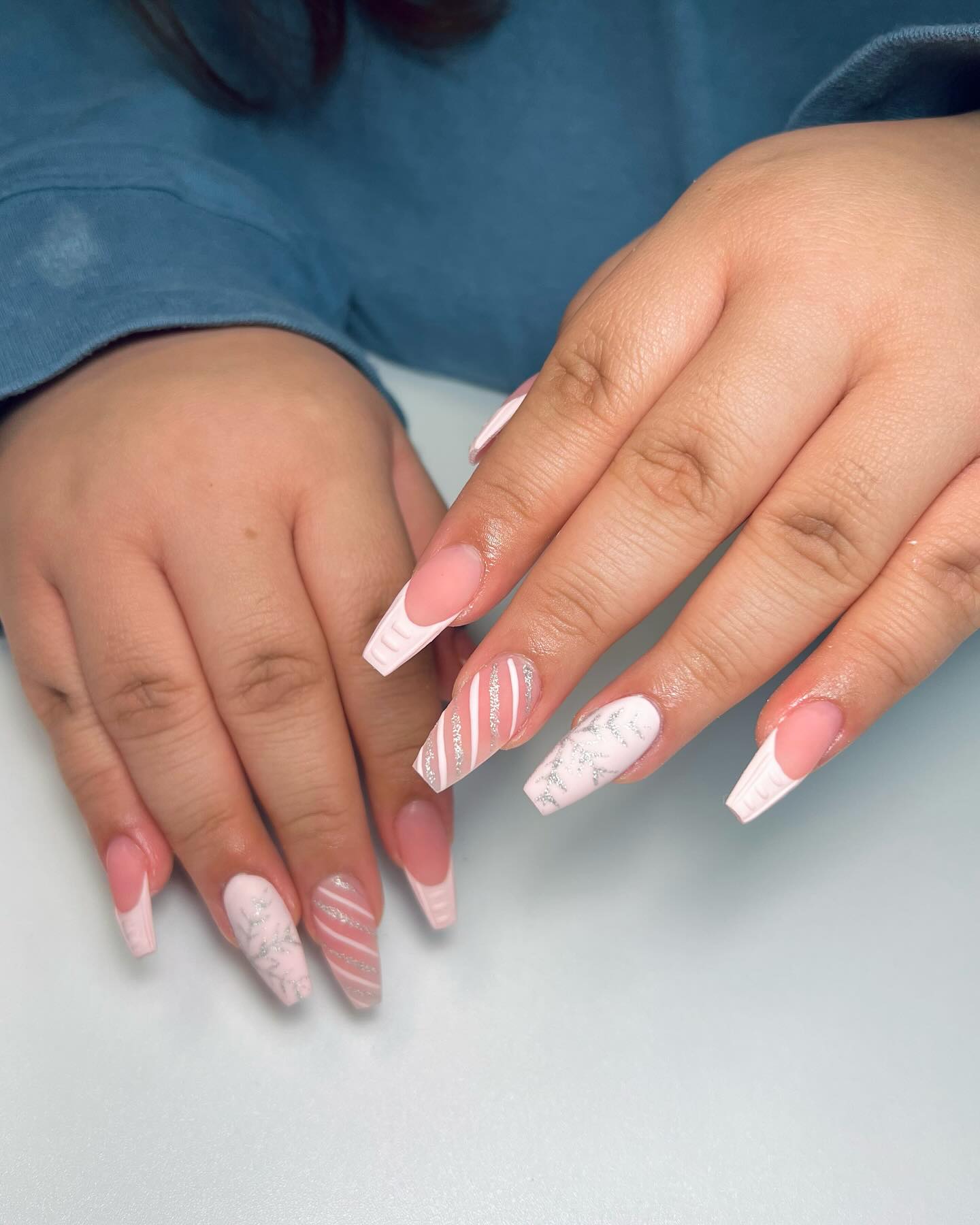 Pink is a stunning color that can give you a lovely nail look in the wintertime. This nail set features snowflakes and Christmas trees, making it an exciting choice for anyone looking forward to enjoying the festive season.