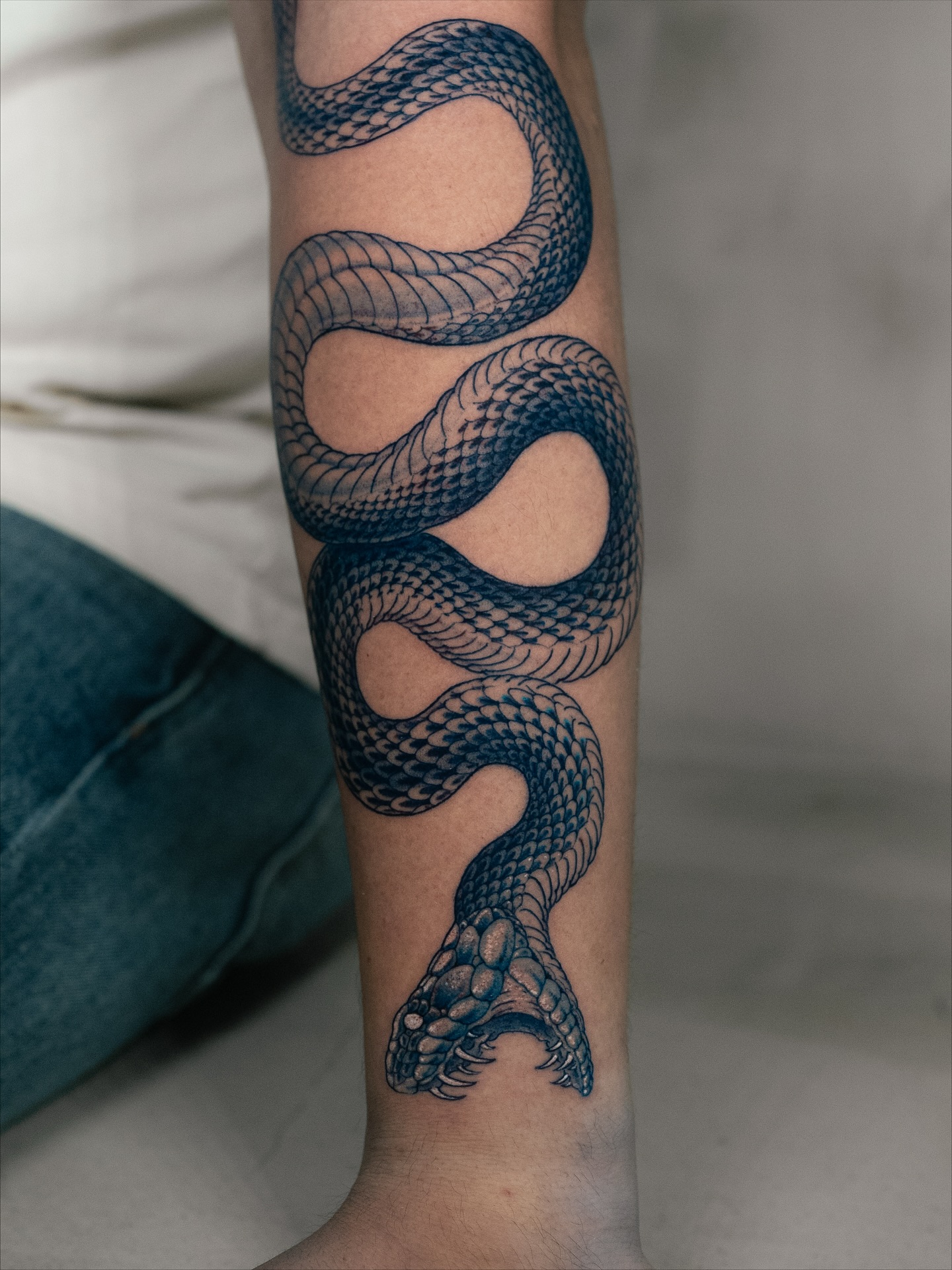 Ancient symbolism meets modern placement. The Ouroboros—a snake eating its own tail—forms a perfect, infinite loop around the forearm. This symbol of cyclicality, eternity, and self-destruction/rebirth is powerful in its simplicity.