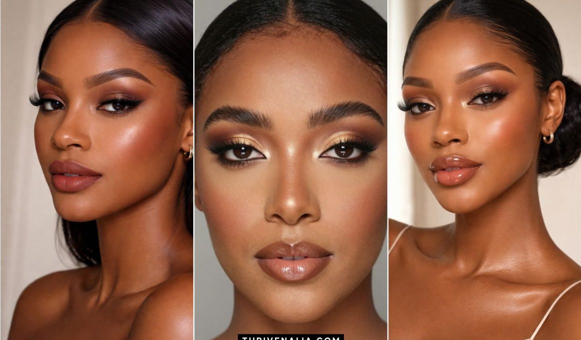 This look has soft taupe brown eyes, clean lashes, velvet nude lips, and softly sculpted skin for a chic soft glam finish. It is perfect for Black women who like a more understated look that still feels smooth, elegant, and put together.