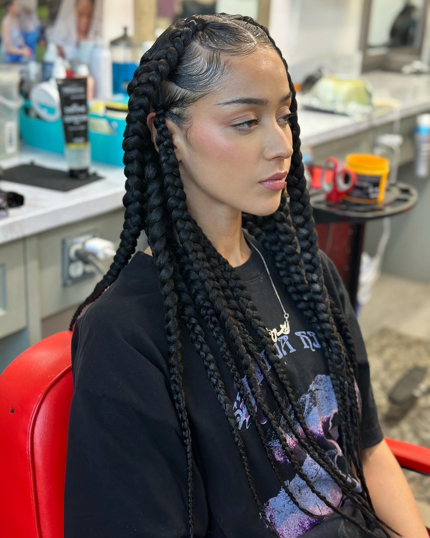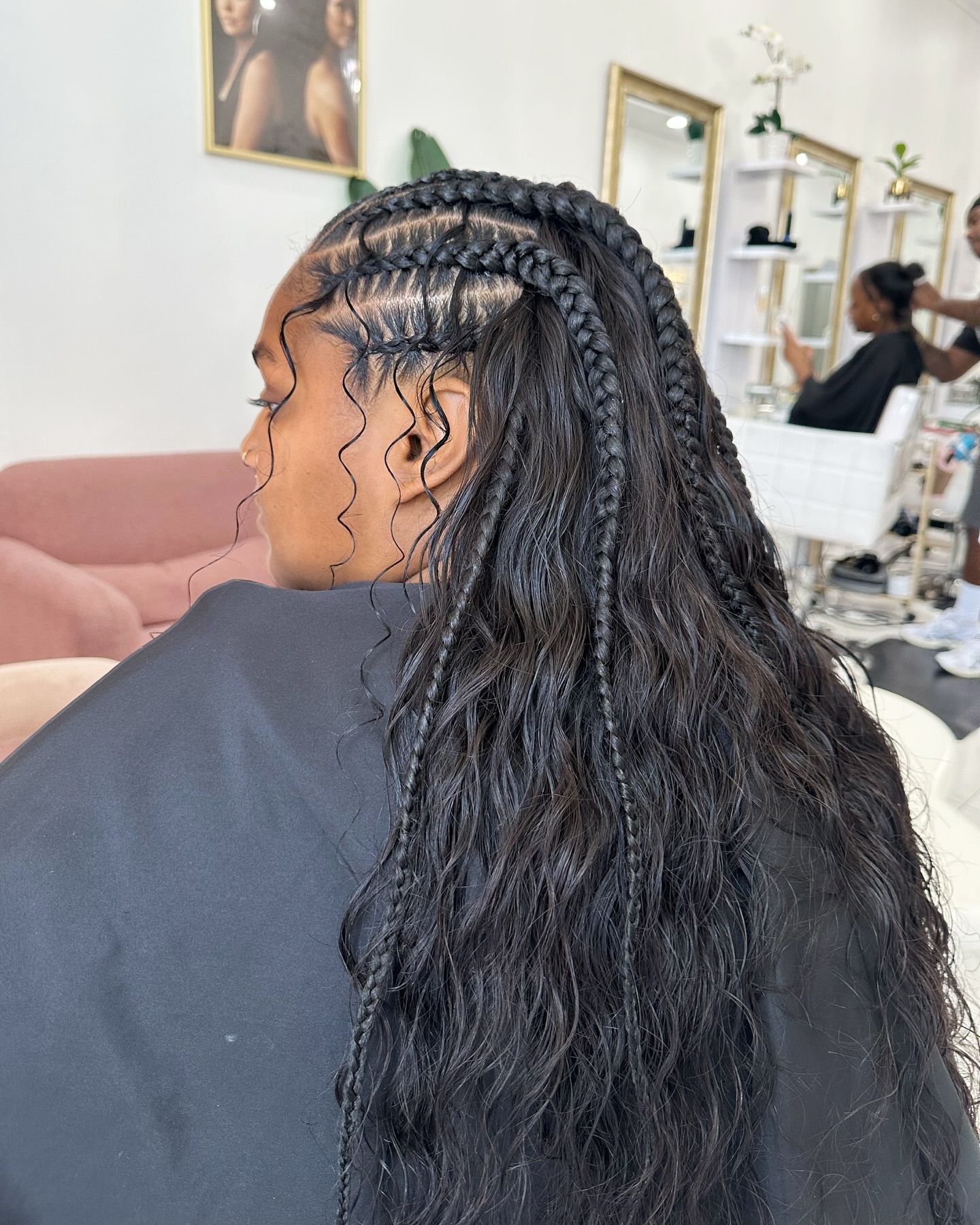 I like goddess braids because they are thick and lie close to the scalp. They usually have a center part and go toward the back. This style protects my hair while looking neat and stylish.